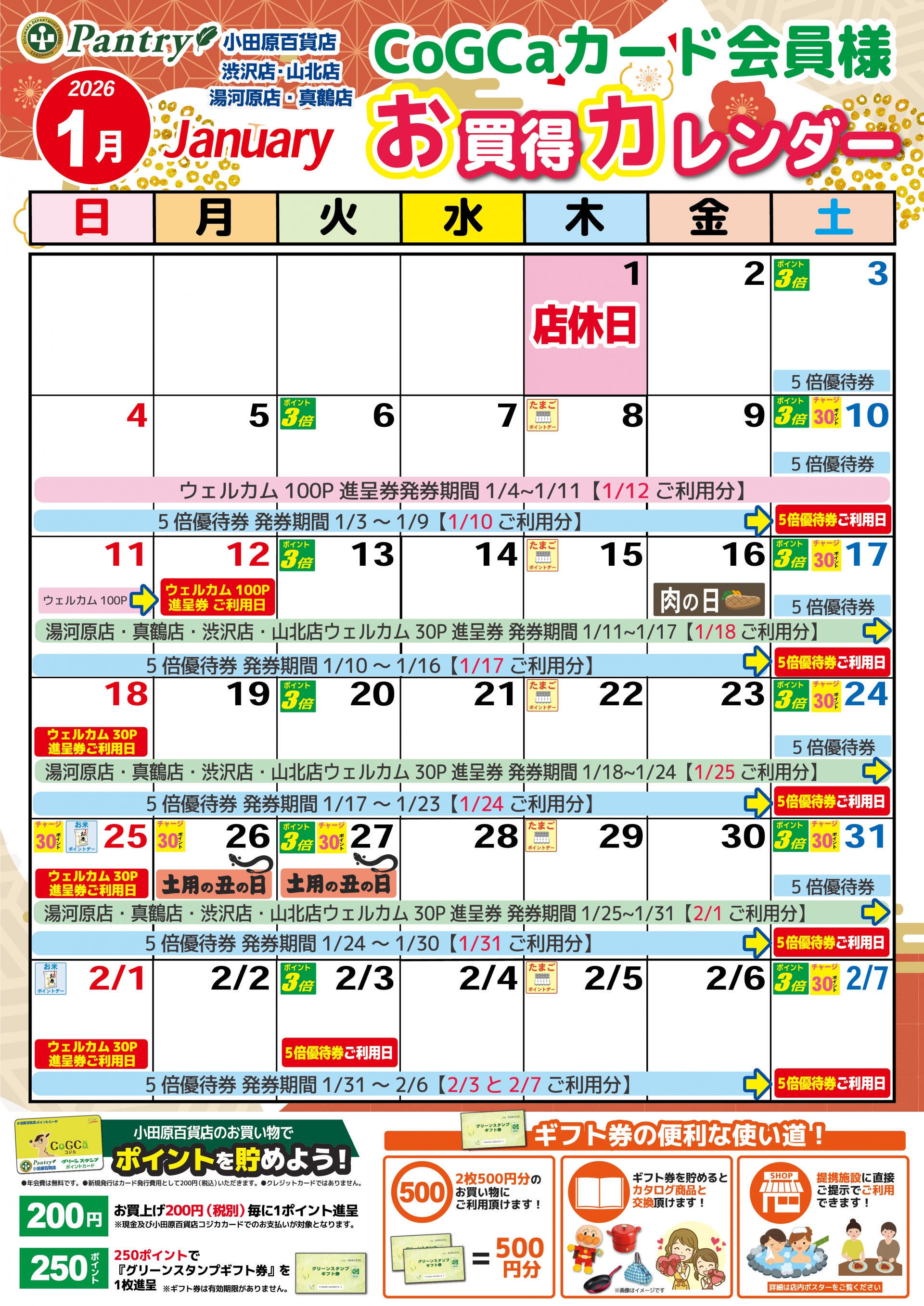 『渋沢・湯河原・真鶴・山北』2026年1月お買い物カレンダー